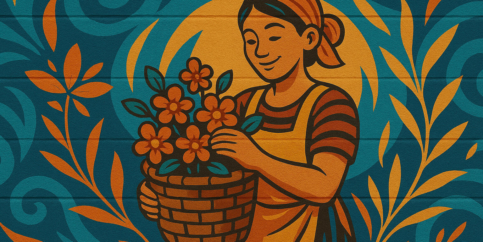 In this mural, I wanted to portray that gentle relationship. The woman holding flowers is a symbol of gratitude, balance, and the small acts of care that keep life moving. It’s not mythology, but everyday reverence—how ordinary people become guardians of the land without ever calling themselves protectors.